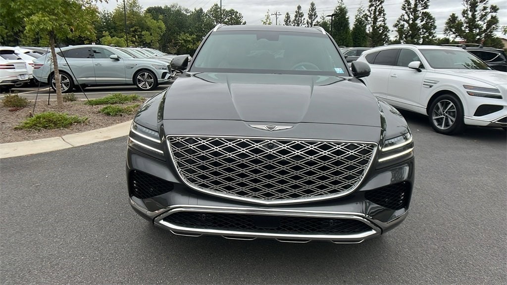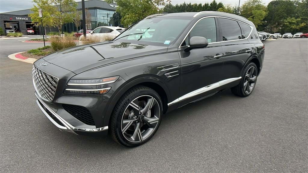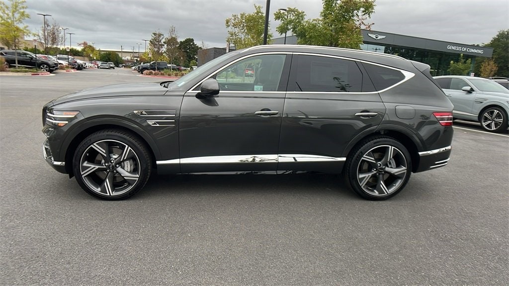 18 Speakers, 3rd row seats: split-bench, 4-Wheel Disc Brakes, ABS brakes, Adaptive suspension, Air Conditioning, Alloy wheels, AM/FM radio: SiriusXM, Anti-whiplash front head restraints, Auto High-beam Headlights, Auto tilt-away steering wheel, Auto-dimming door mirrors, Auto-dimming Rear-View mirror, Automatic temperature control, Brake assist, Bumpers: body-color, Cargo Blocks, Compass, Delay-off headlights, Driver door bin, Driver vanity mirror, Dual front impact airbags, Dual front side impact airbags, Electronic Stability Control, Emergency communication system: Genesis Connected Services, Exterior Parking Camera Rear, Four wheel independent suspension, Fragrance Cartridge, Front anti-roll bar, Front Bucket Seats, Front Center Armrest, Front dual zone A/C, Front reading lights, Fully automatic headlights, Garage door transmitter: HomeLink, Genuine wood console insert, Genuine wood dashboard insert, Genuine wood door panel insert, Heads-Up Display, Heated & Ventilated Front Bucket Seats, Heated door mirrors, Heated front seats, Heated rear seats, Heated steering wheel, Illuminated entry, Knee airbag, Leather steering wheel, Low tire pressure warning, Memory seat, Nappa Leather Seating Surfaces, Navigation System, Occupant sensing airbag, Option Group 01, Outside temperature display, Overhead airbag, Overhead console, Panic alarm, Passenger door bin, Passenger vanity mirror, Power door mirrors, Power driver seat, Power Liftgate, Power moonroof, Power passenger seat, Power steering, Power windows, Radio data system, Radio: AM/FM/SiriusXM/HD Bang & Olufsen Sound Sys, Rain sensing wipers, Rear air conditioning, Rear anti-roll bar, Rear dual zone A/C, Rear reading lights, Rear seat center armrest, Rear side impact airbag, Rear window defroster, Rear window wiper, Reclining 3rd row seat, Remote keyless entry, Security system, Speed control, Speed-sensing steering, Speed-Sensitive Wipers, Split folding rear seat, Spoiler, Steering wheel memory, Steering wheel mounted audio controls, Tachometer, Telescoping steering wheel, Tilt steering wheel, Traction control, Trip computer, Turn signal indicator mirrors, Variably intermittent wipers, Ventilated front seats, Ventilated rear seats, Wheels: 22" x 9.5J Dark Gray Matte Alloy.